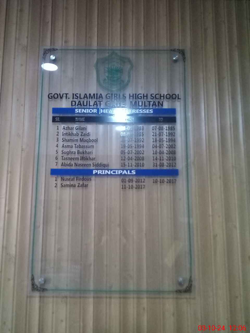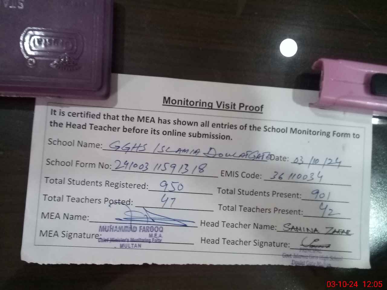 | EMIS Code: 36110034 | Name of School: GGHS ISLAMIA DOULAT GATE MULTAN | |||