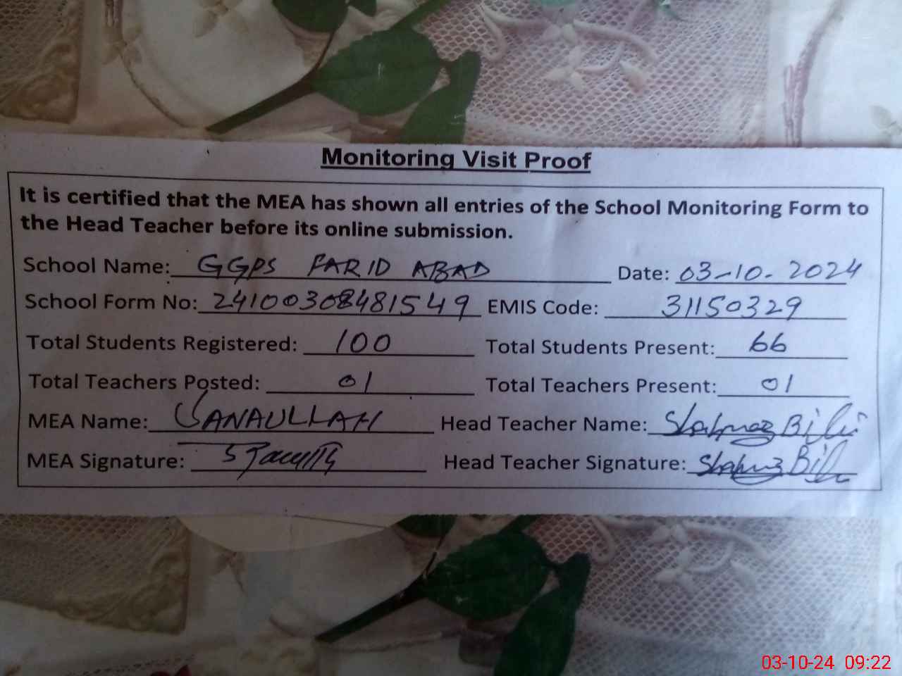 | EMIS Code: 31150329 | Name of School: GGPS FARID ABAD | |||