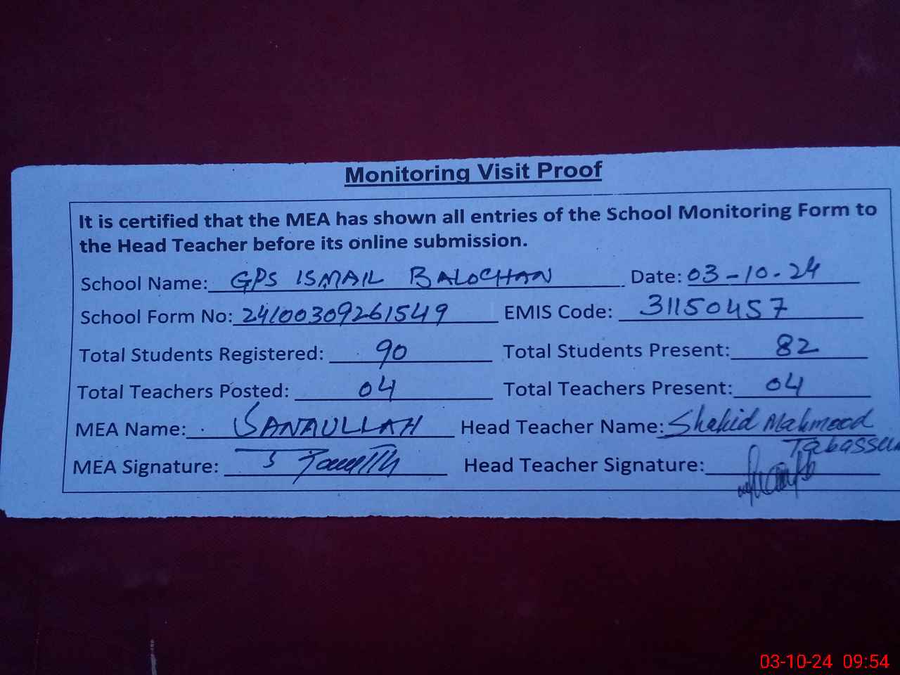| EMIS Code: 31150457 | Name of School: GPS ISMAEEL BALOCHAN | |||