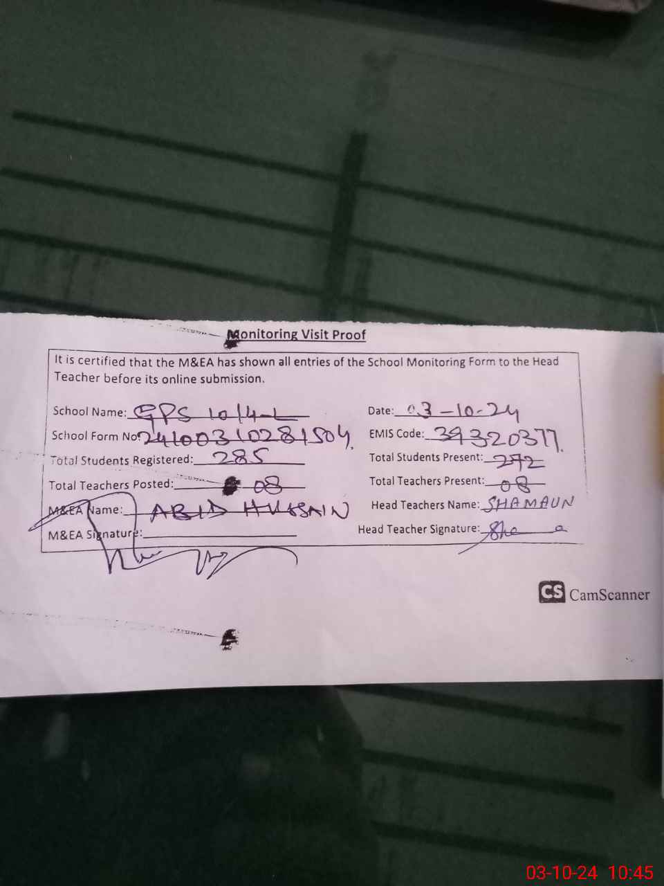 | Attendance Register | Head Teacher | MEA with School | Visit Proof |