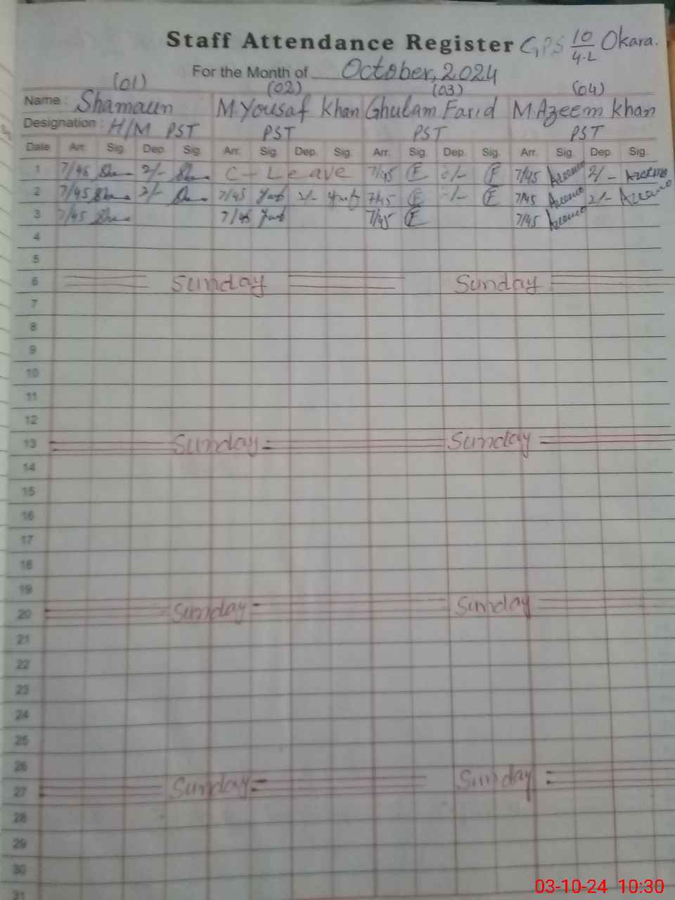 | CNIC | Full Name | Designation | R/C | Absence During Last Calender Month |