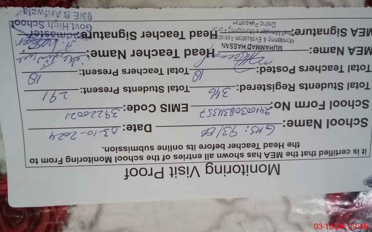 | EMIS Code: 39220021 | Name of School: GHS 93/E-B TEH ARIF WALA | |||