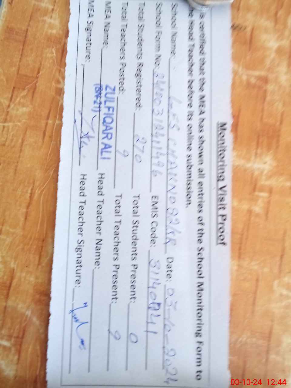 | Attendance Register | Head Teacher | MEA with School | Visit Proof |