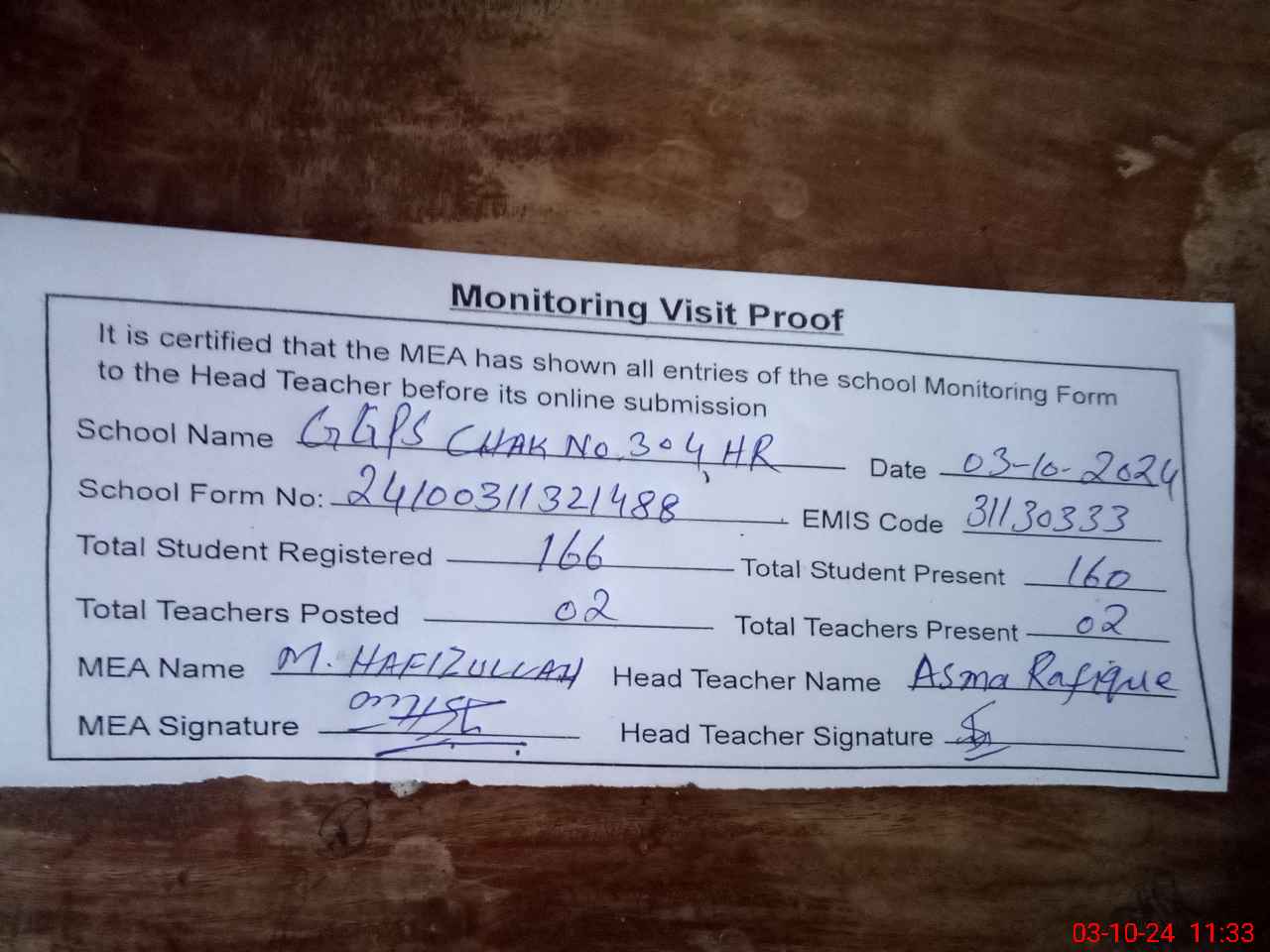 | EMIS Code: 31130333 | Name of School: GGPS CHAK NO 304 HR | |||