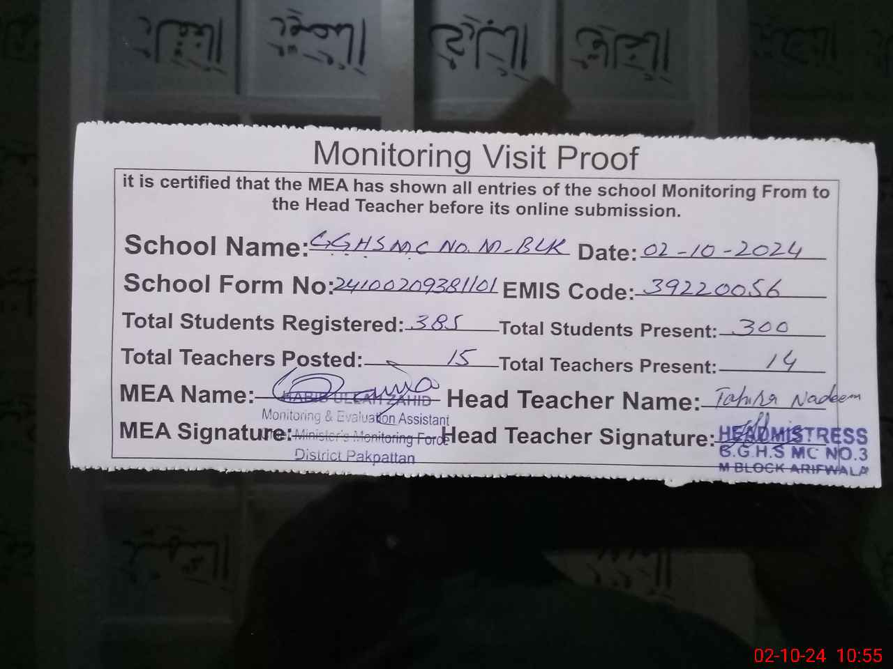| EMIS Code: 39220056 | Name of School: GGHS MC NO.3 M BLOCK ARIFWALA | |||
