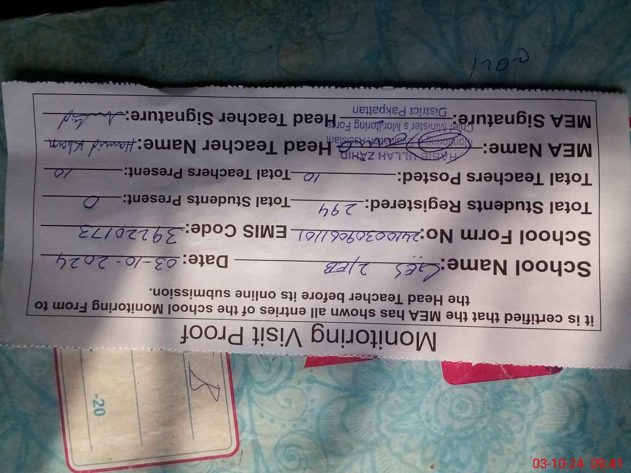 | Certified that this School was Inspected by the Undersigned MEA/DMO Today and the Information Stated Above is as Per Record. | |||||