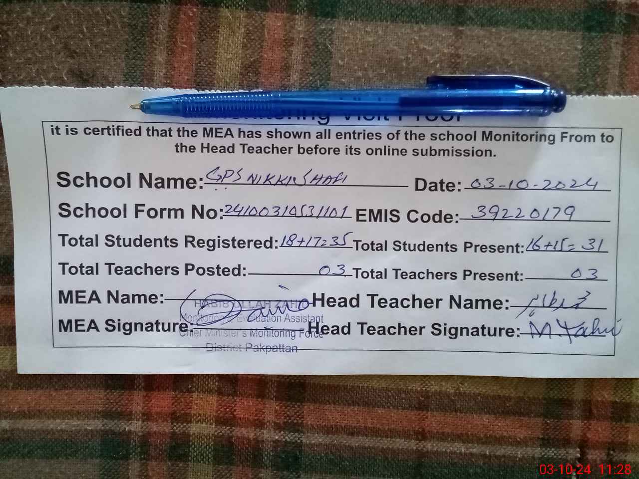 | EMIS Code: 39220179 | Name of School: GPS NIKKI SHAFI P/O SHAFI ARIFWALA | |||