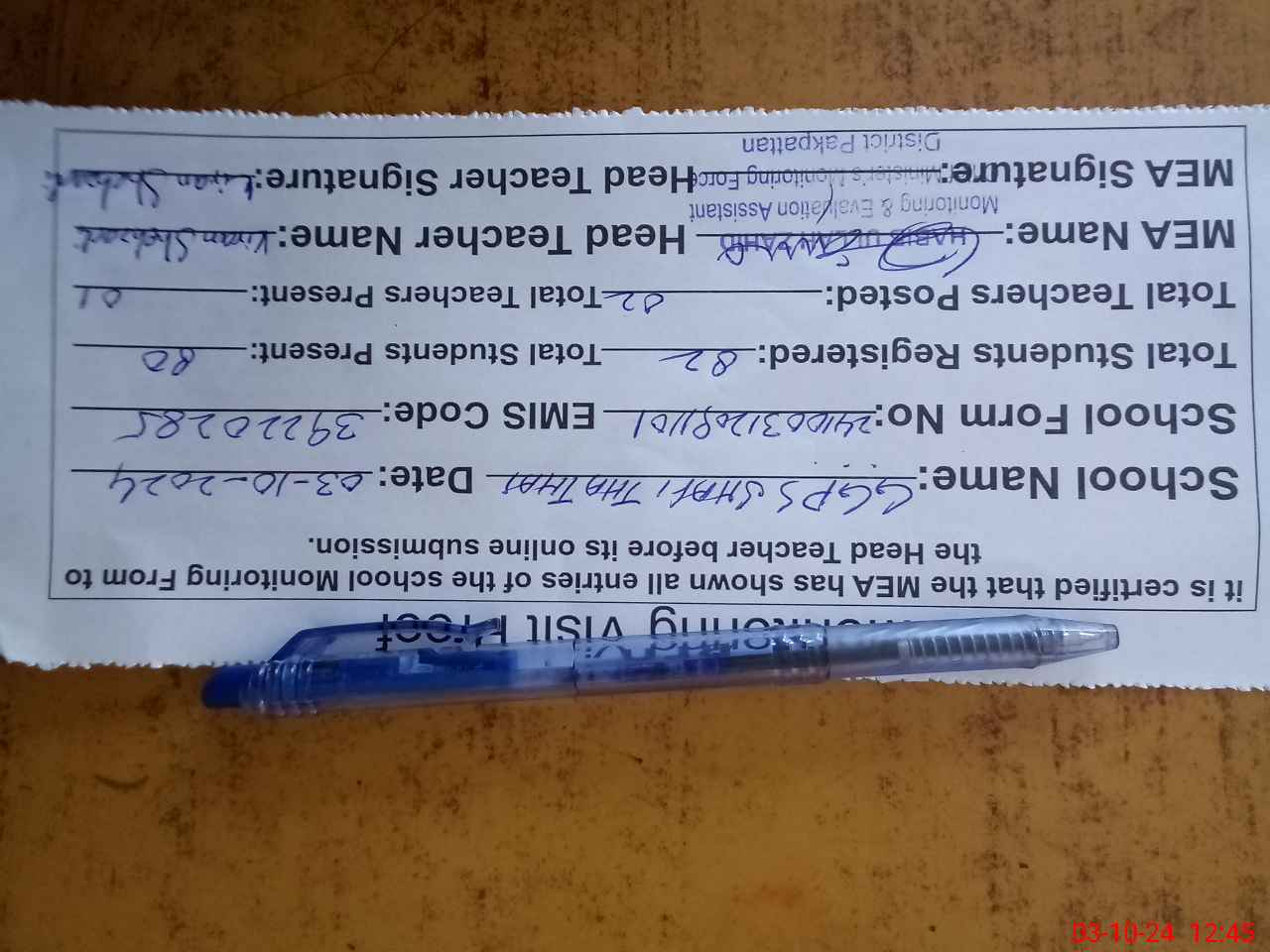 | Monitoring Date: 03-10-2024 | Start Time: 03-10-2024 12:09 PM | End Time: 03-10-2024 12:45 PM | Name of MEA: Ha**** Ul**** Ur**** Ba**** Al**** | |