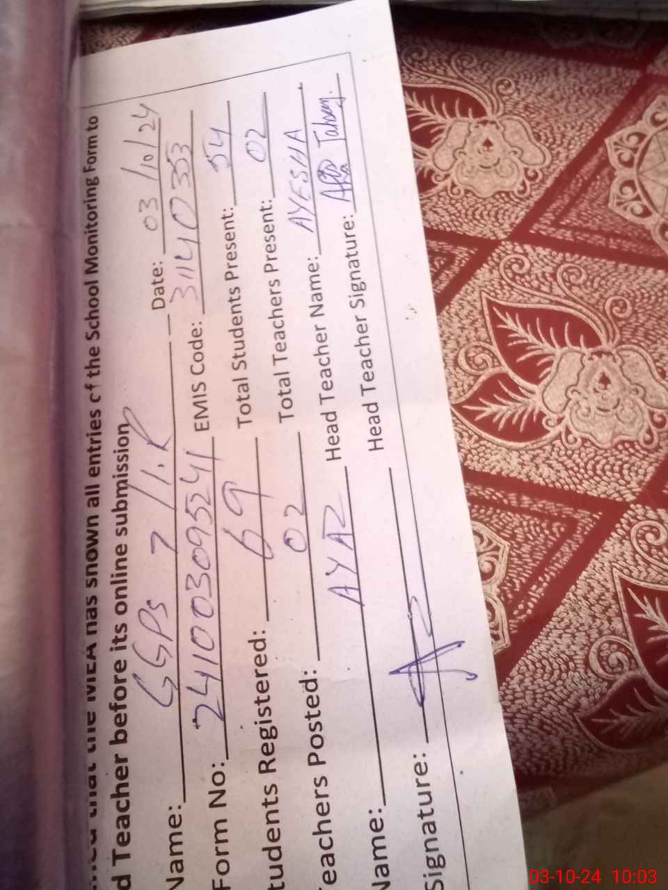 | Name: Ay**** Te**** Designation: (School Headmaster's/Headmistress's) PST Phone/Cell Number: 03**** |