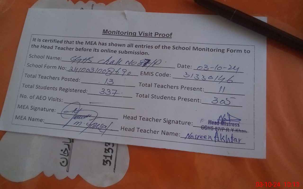 | EMIS Code: 31330146 | Name of School: GGHS CHAK NO. 87/P | |||