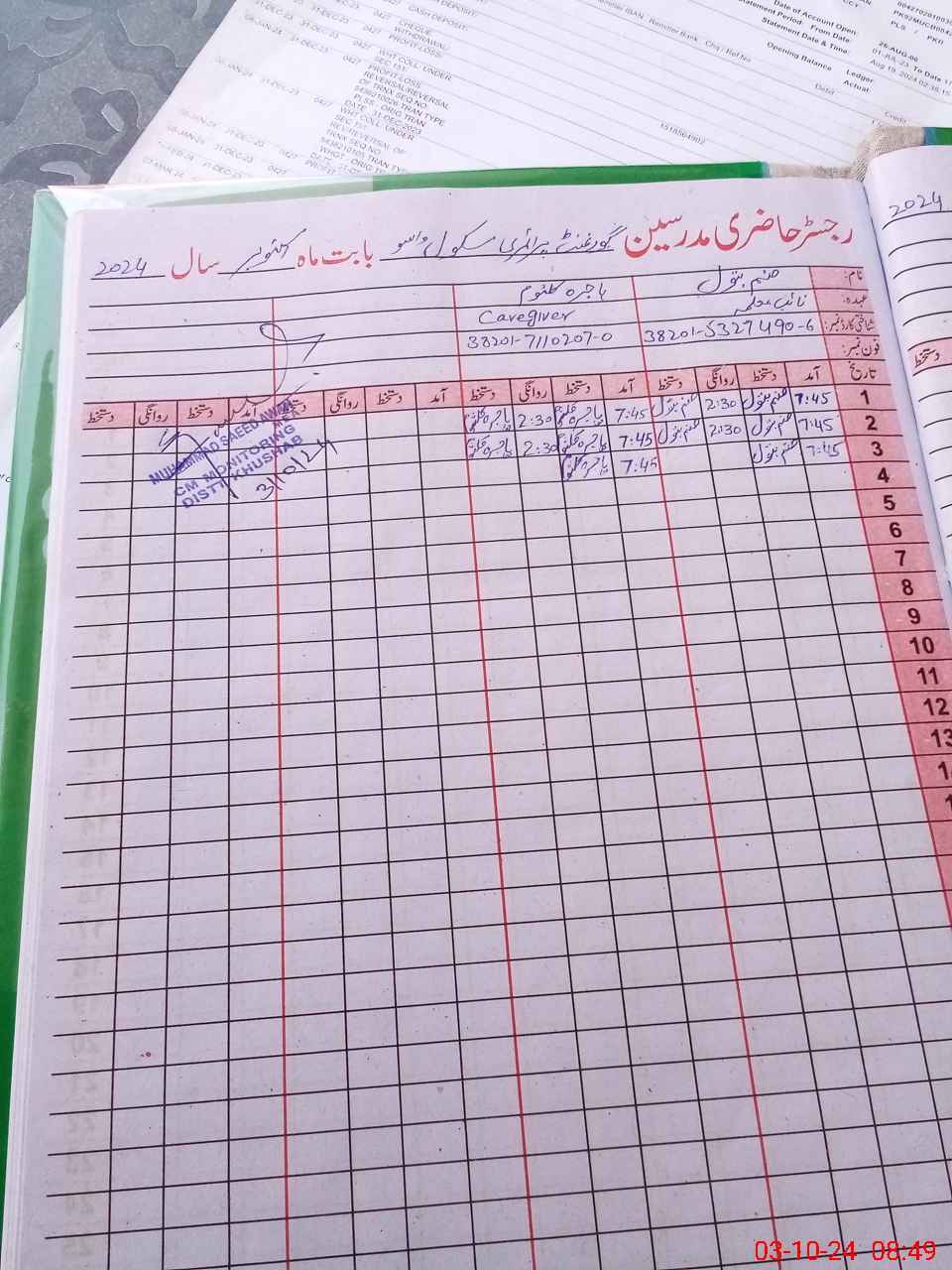 | Name: MId**** Designation: (School Headmaster's/Headmistress's) PST/PTC/JV Phone/Cell Number: 03**** |