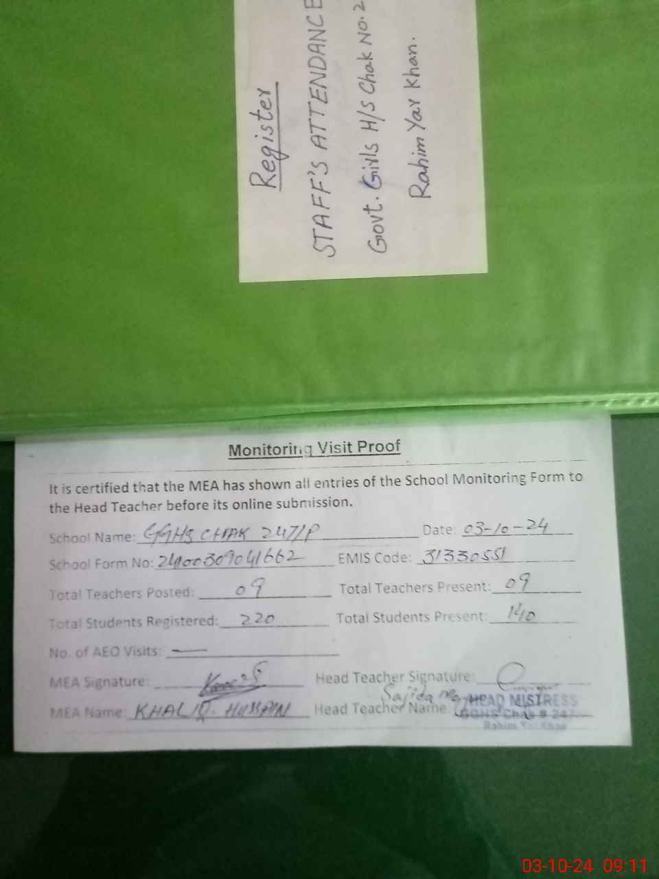 | Attendance Register | Head Teacher | MEA with School | Visit Proof |