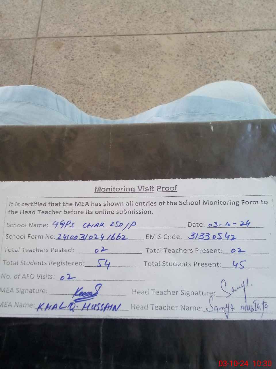 | Monitoring Date: 03-10-2024 | Start Time: 03-10-2024 10:11 AM | End Time: 03-10-2024 10:32 AM | Name of MEA: Kh**** Hu**** | |