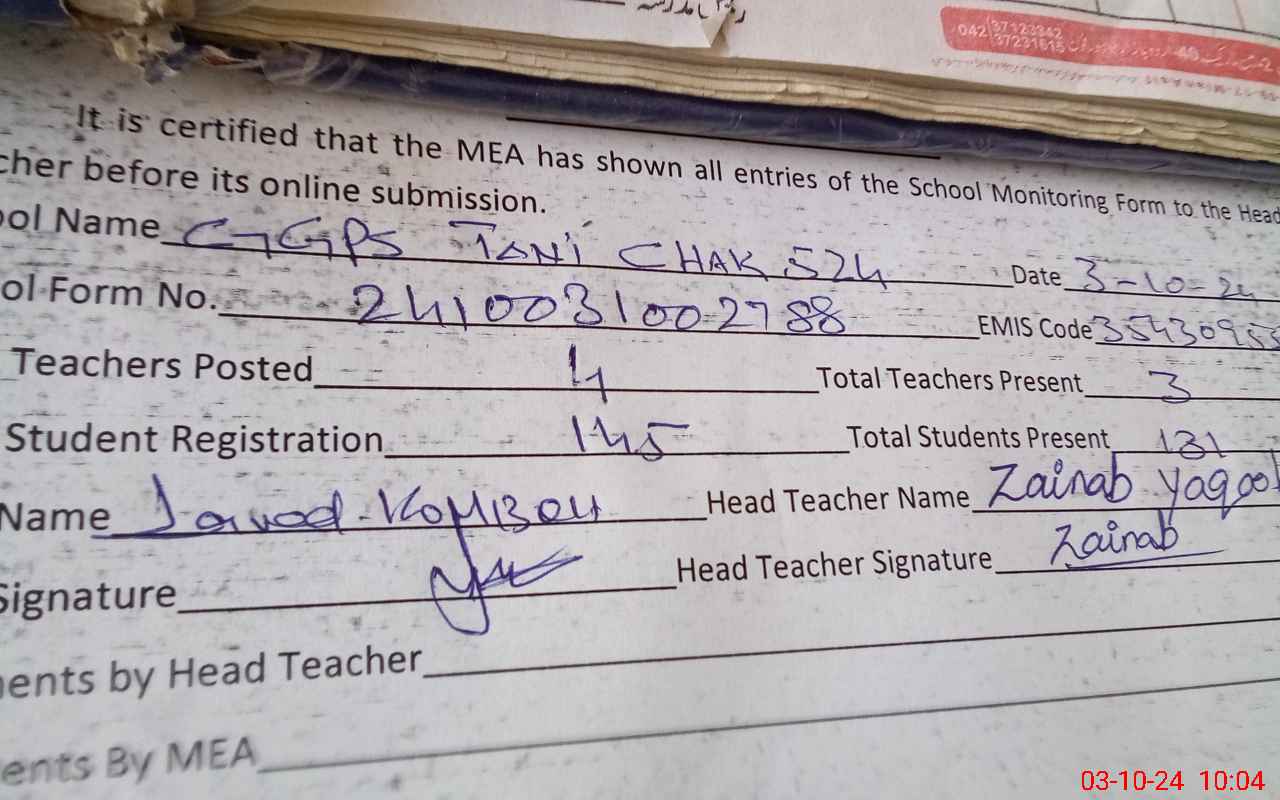 | Name: ZA**** YA**** Designation: (School Headmaster's/Headmistress's) PST SCI-MATH Phone/Cell Number: 03**** |