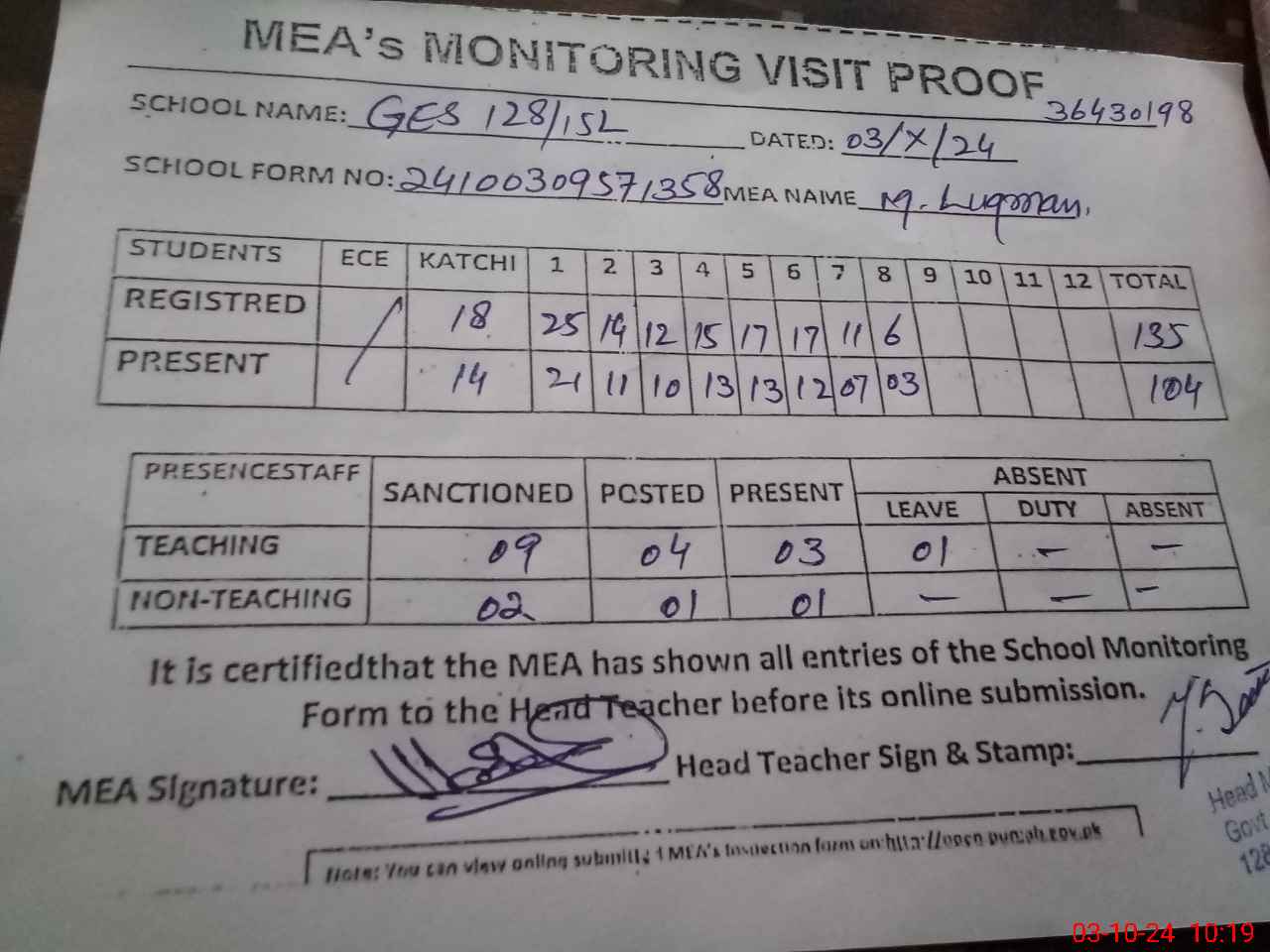 | Monitoring Date: 03-10-2024 | Start Time: 03-10-2024 09:27 AM | End Time: 03-10-2024 10:20 AM | Name of MEA: Mu**** Lu**** | |