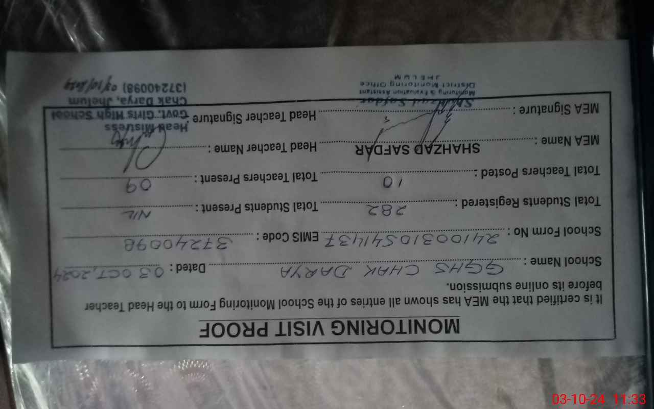 | EMIS Code: 37240098 | Name of School: GGHS CHAK DARYA | |||