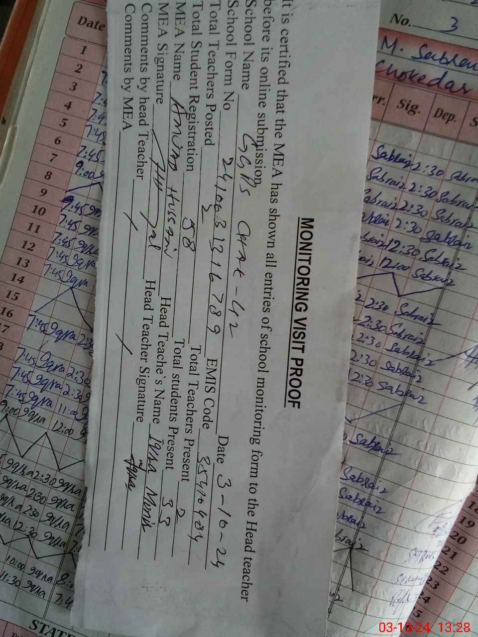 | Attendance Register | Head Teacher | MEA with School | Visit Proof |
