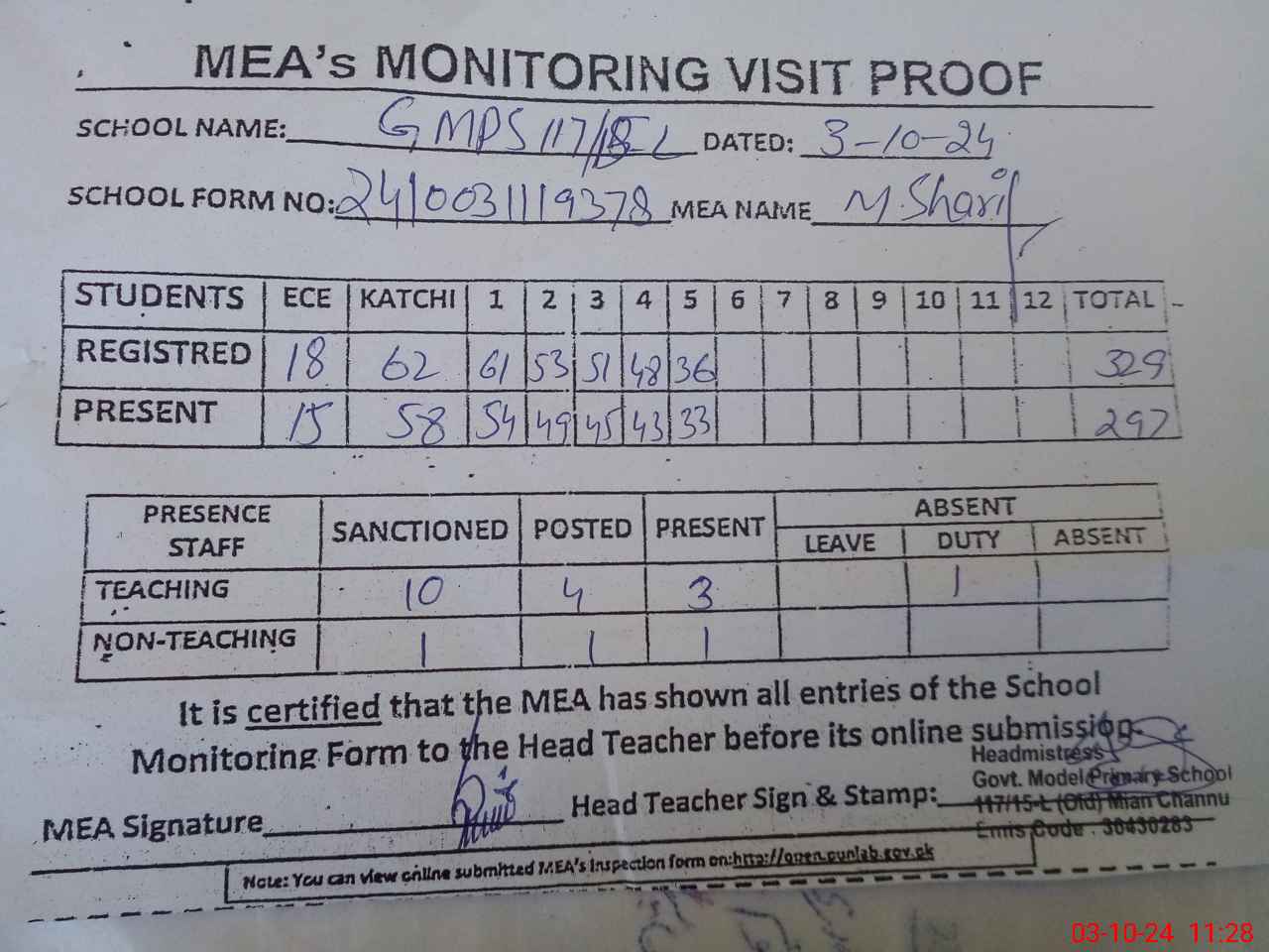 | EMIS Code: 36430283 | Name of School: GMES 117/15-L OLD, MIAN CHANNU | |||