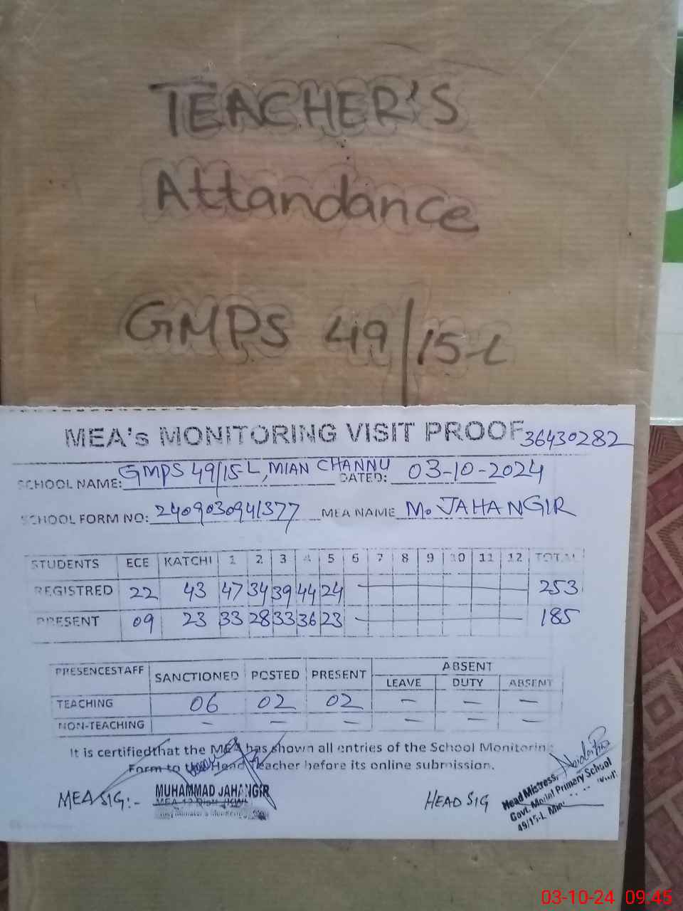 | EMIS Code: 36430282 | Name of School: GMPS 49/15-L, MIAN CHANNU | |||