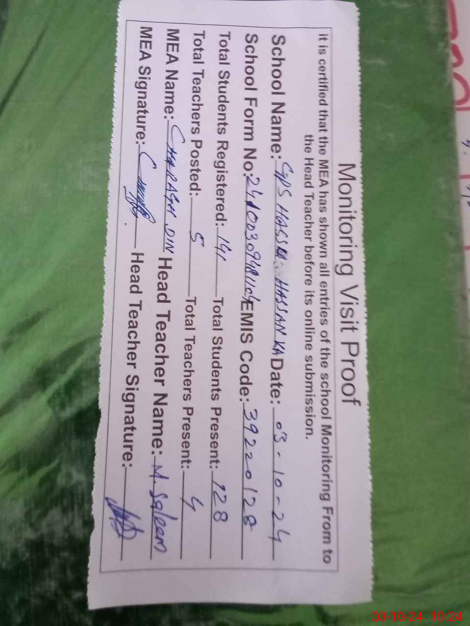 | Attendance Register | Head Teacher | MEA with School | Visit Proof |