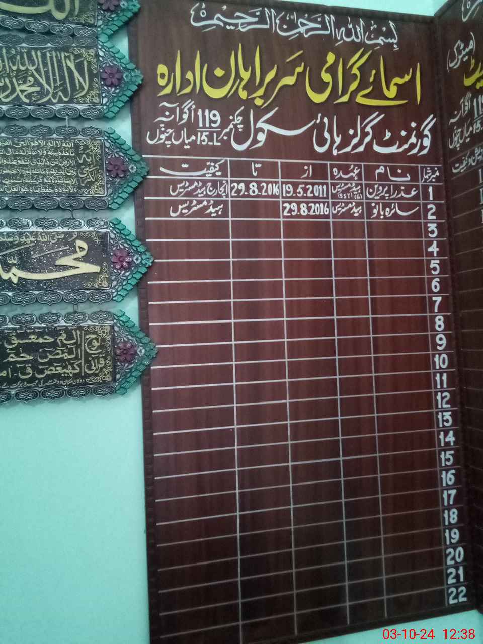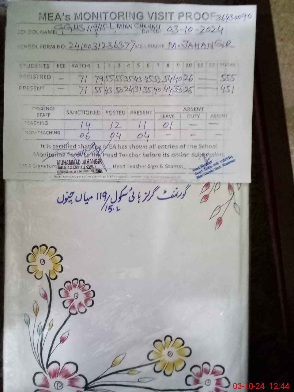| EMIS Code: 36430090 | Name of School: GGHS 119/15-L, MIAN CHANNU | |||
