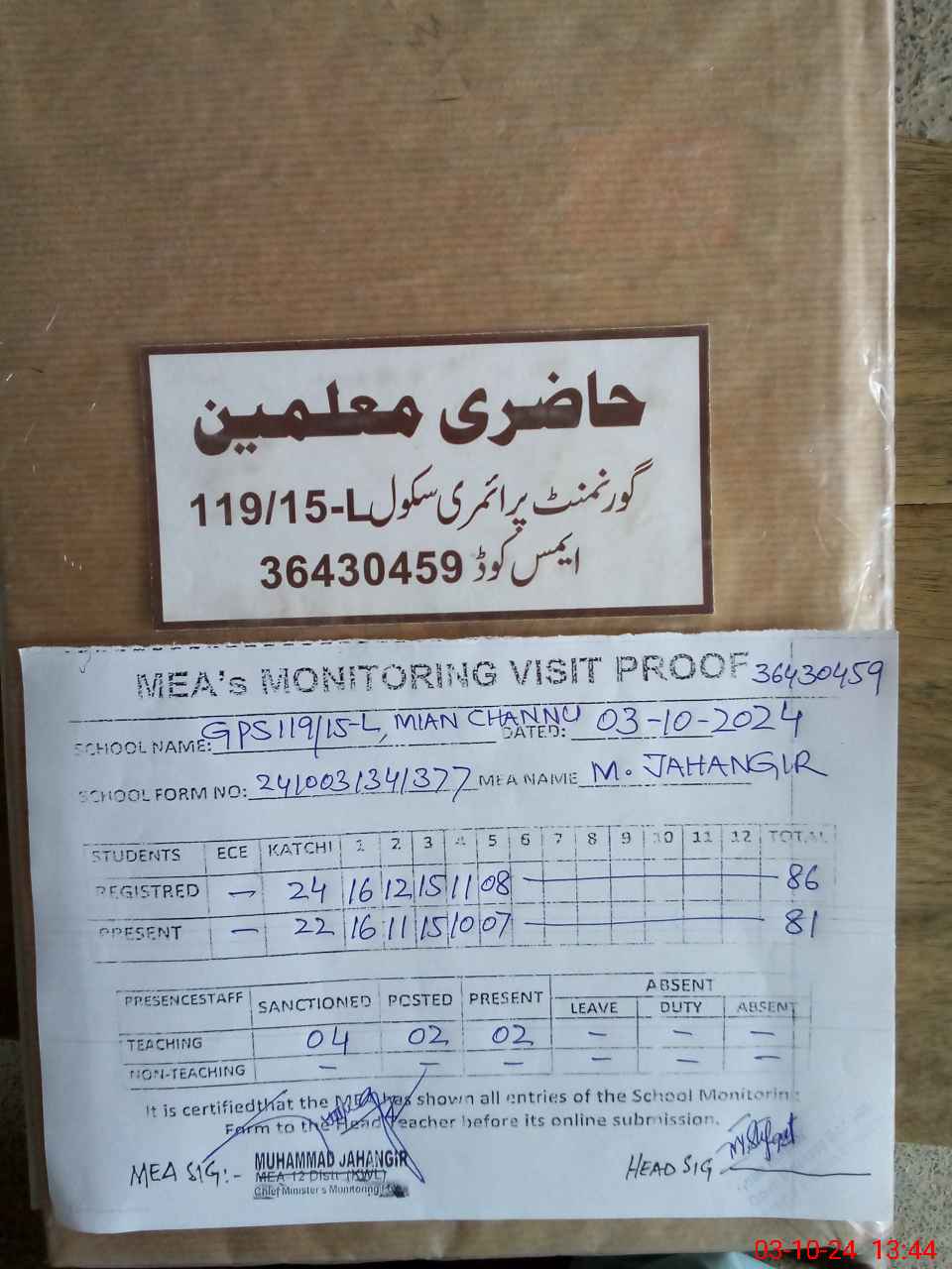 | EMIS Code: 36430459 | Name of School: GPS 119/15-L, MIAN CHANNU | |||
