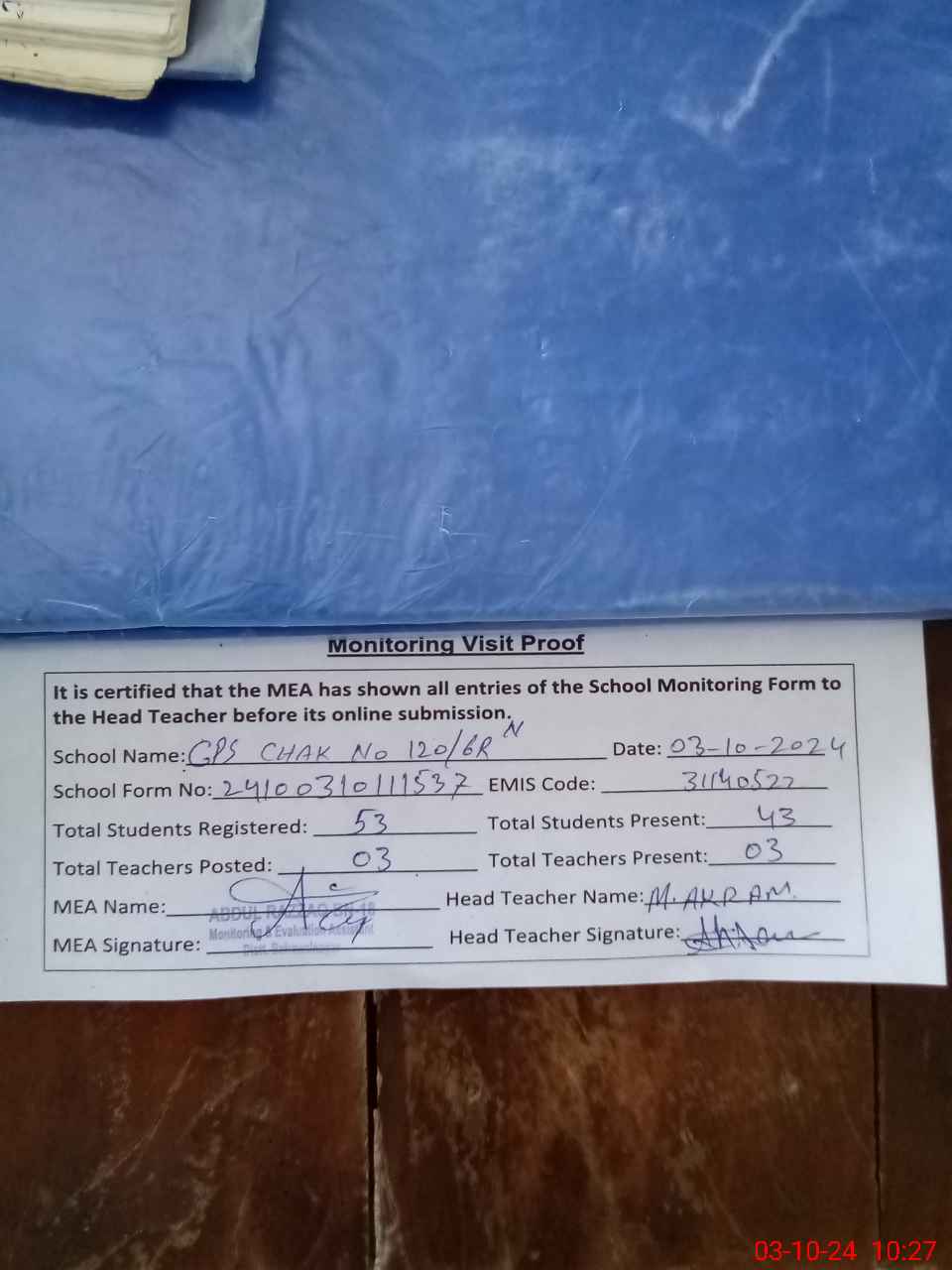 | Attendance Register | Head Teacher | MEA with School | Visit Proof |