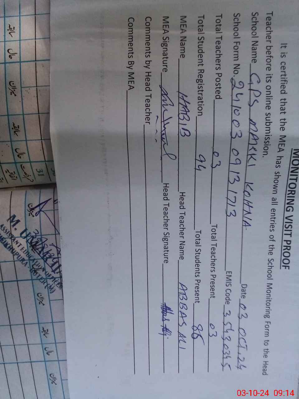 | Monitoring Date: 03-10-2024 | Start Time: 03-10-2024 08:45 AM | End Time: 03-10-2024 09:17 AM | Name of MEA: Mu**** Ha**** | |