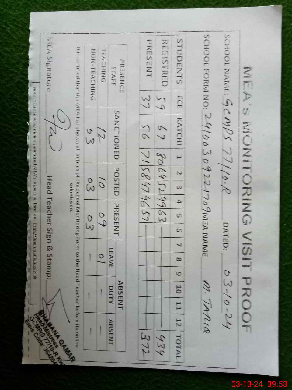| Monitoring Date: 03-10-2024 | Start Time: 03-10-2024 09:22 AM | End Time: 03-10-2024 10:11 AM | Name of MEA: MU**** TA**** | |