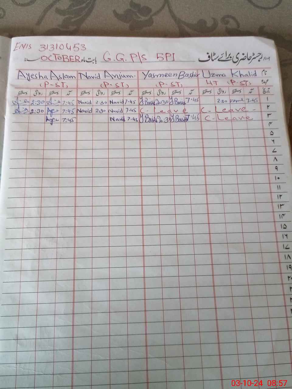 | 31**** | Uz**** Kh**** | 1 | 1 | 0 | 0 | 0 | 0 | 0 | 0 | 0 | 0 | 0 | Absent (Un-Authorized) |