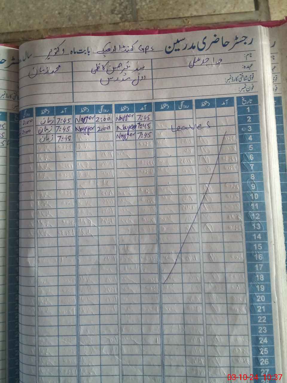 | CNIC | Full Name | Designation | R/C | Absence During Last Calender Month |