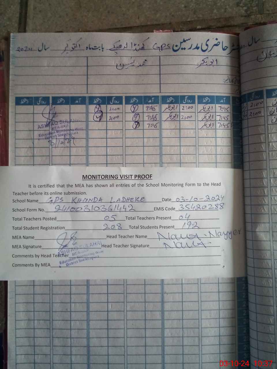 | Attendance Register | Head Teacher | MEA with School | Visit Proof |