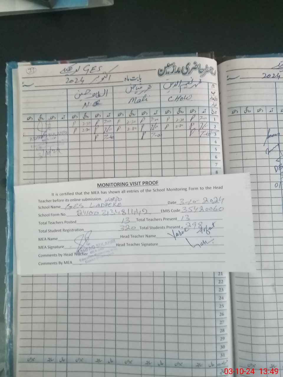 | Attendance Register | Head Teacher | MEA with School | Visit Proof |