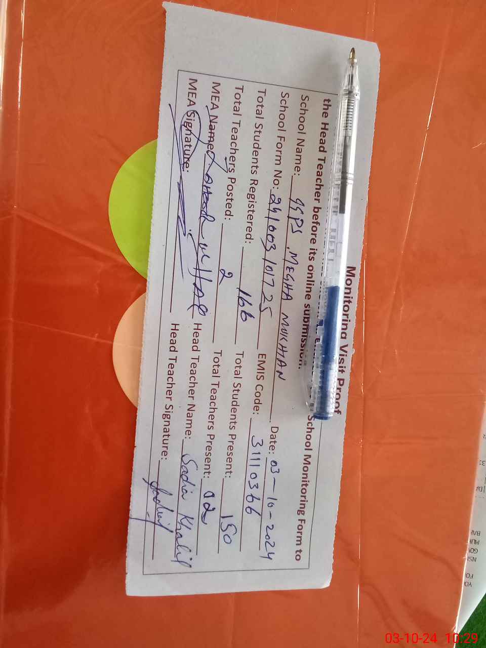 | Attendance Register | Head Teacher | MEA with School | Visit Proof |