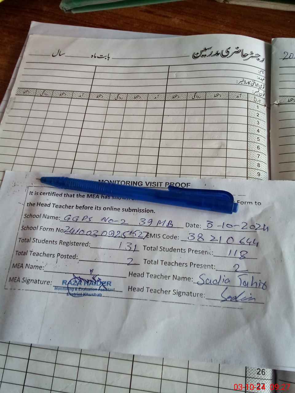 | EMIS Code: 38210644 | Name of School: GGPS NO. 2 CHAK NO. 39 MB | |||