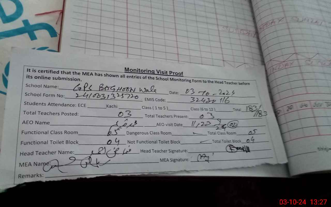 | EMIS Code: 32430116 | Name of School: GPS BAGHOON WALA | |||