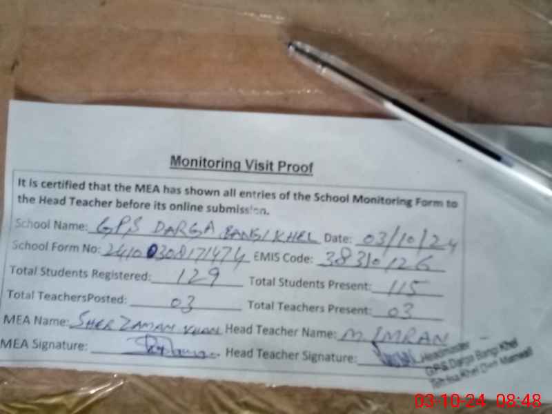 | EMIS Code: 38310126 | Name of School: GPS DARGA BANGI KHEL | |||