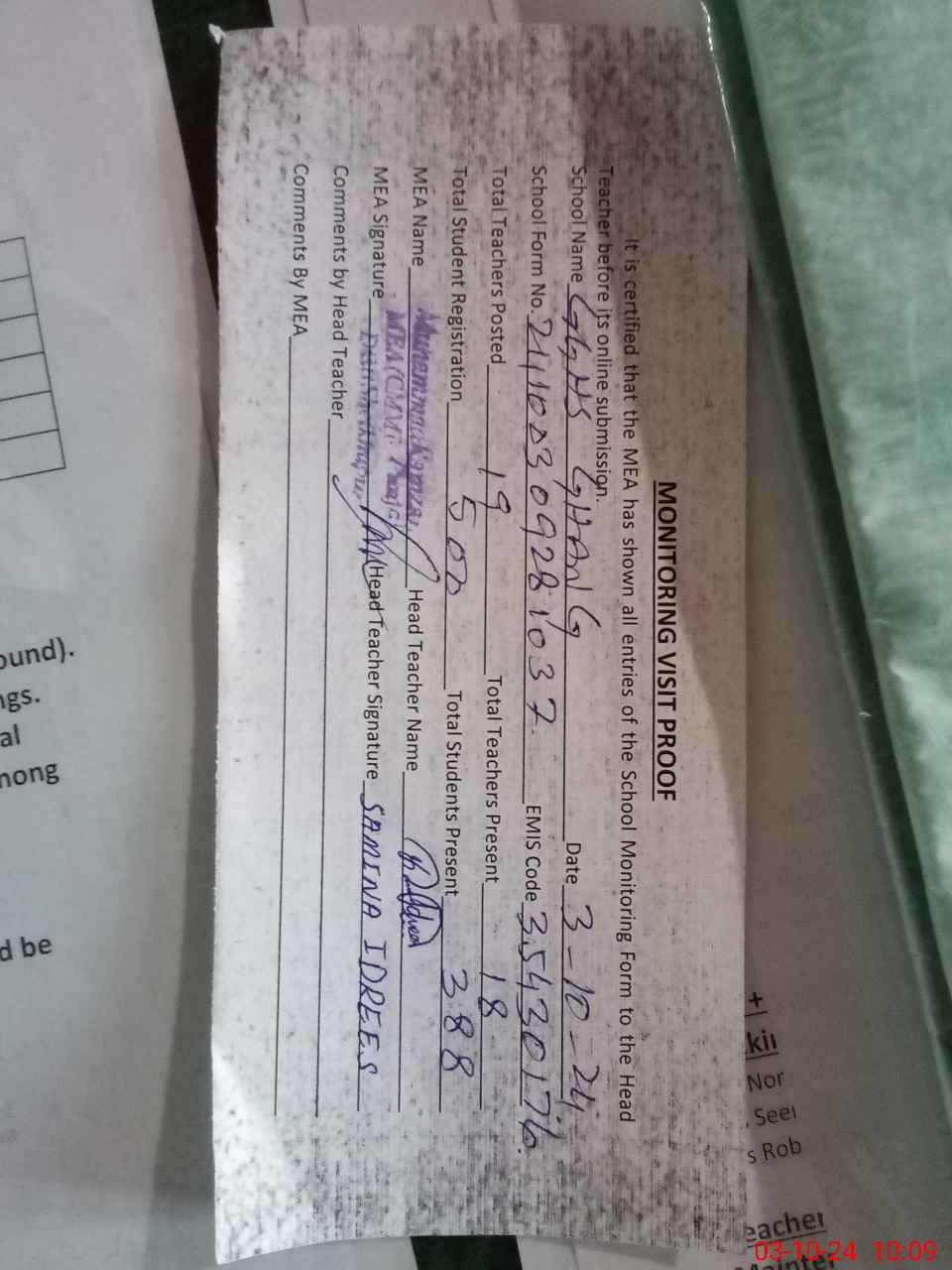 | Certified that this School was Inspected by the Undersigned MEA/DMO Today and the Information Stated Above is as Per Record. | |||||