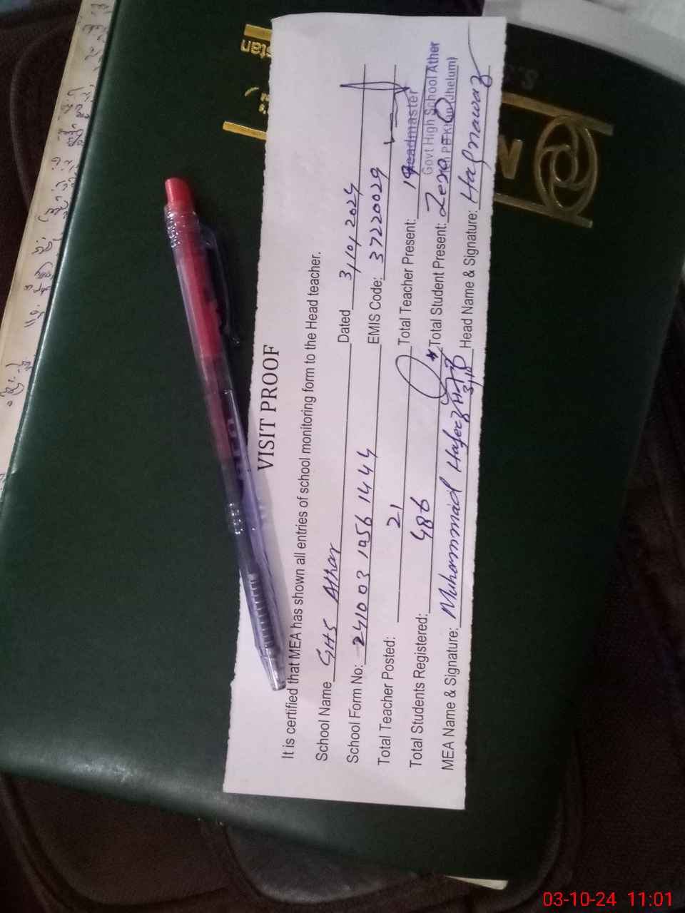 | Attendance Register | Head Teacher | MEA with School | Visit Proof |