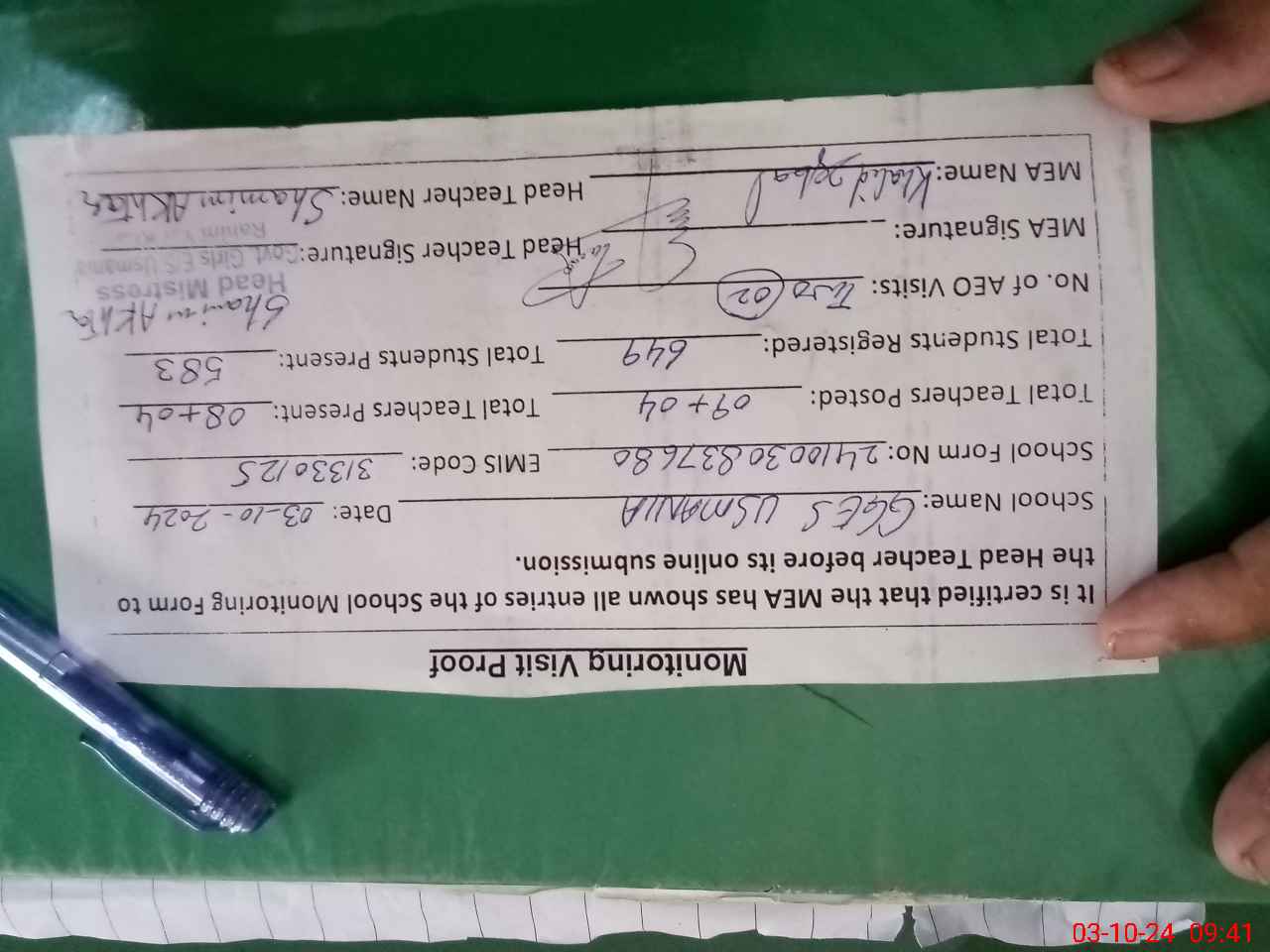 | Remarks (Use Separate Page if Required): Class verification is not updated on mea tab as per sis and GGPS Ghosia colony merged into GGES Usmania with students strength 250 and staff six teachers as per CEO letter 6712 from October 2021and four classes are sitting underlped | |||||