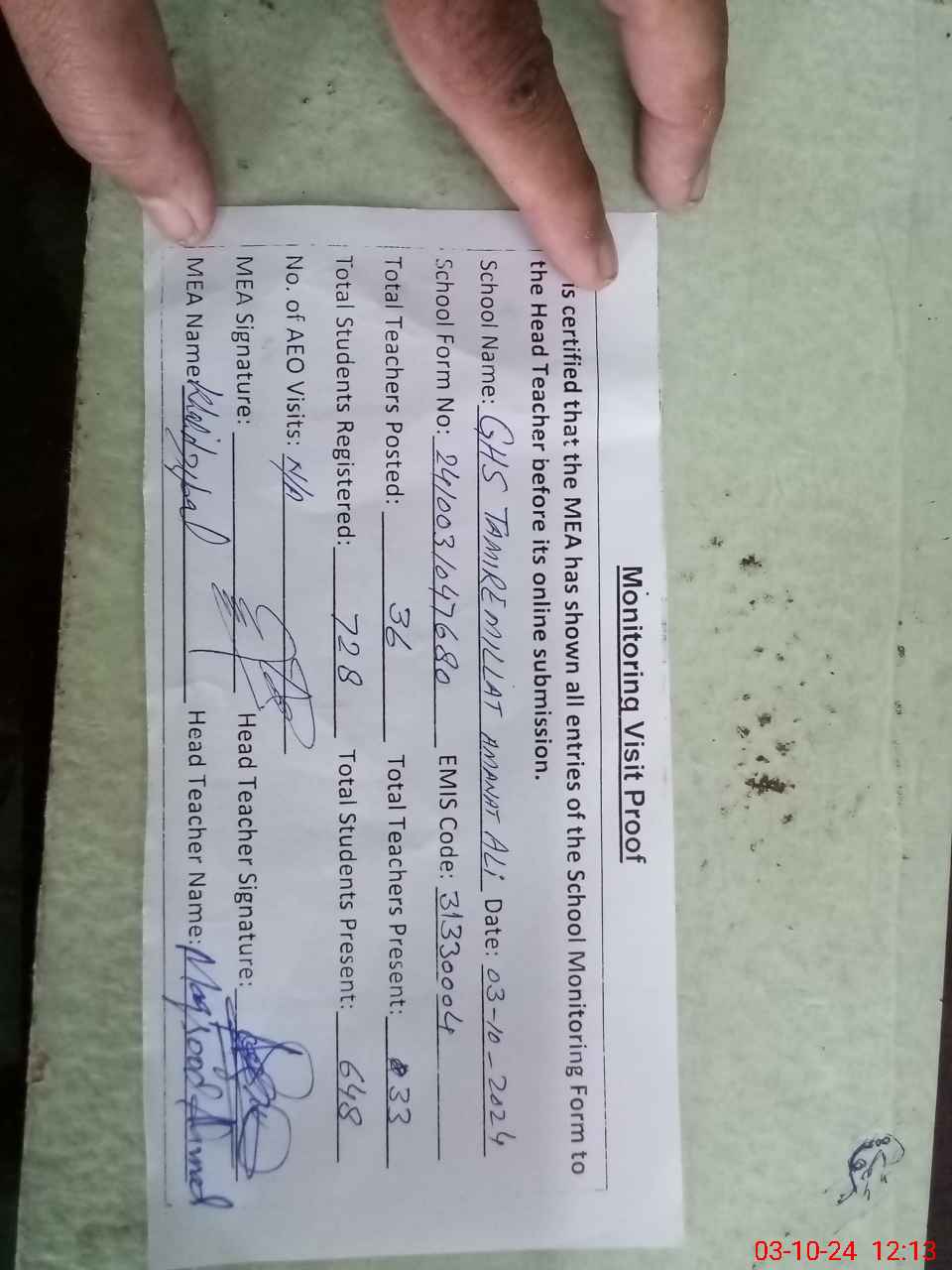 | Attendance Register | Head Teacher | MEA with School | Visit Proof |