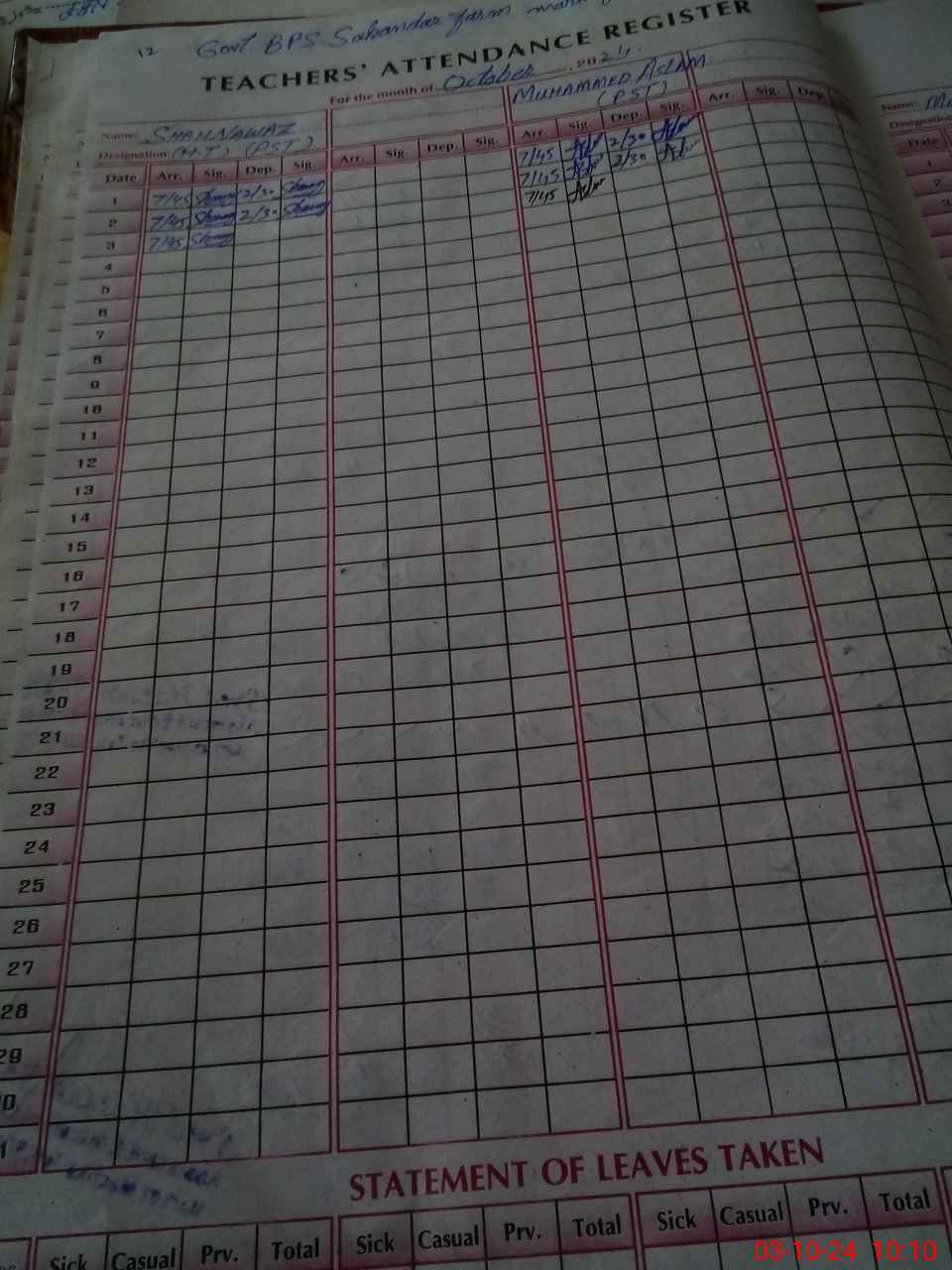 | Name: SH**** Designation: (School Headmaster's/Headmistress's) PST/PTC/JV Phone/Cell Number: 03**** |