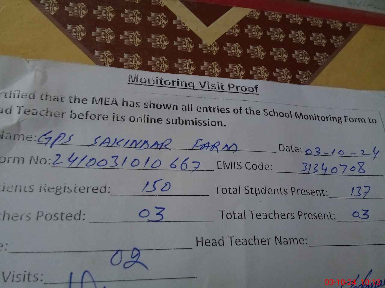 | Attendance Register | Head Teacher | MEA with School | Visit Proof |