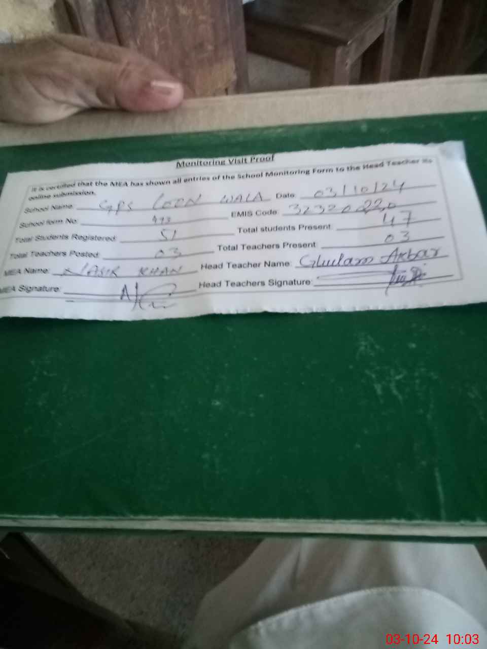 | Monitoring Date: 03-10-2024 | Start Time: 03-10-2024 09:43 AM | End Time: 03-10-2024 10:08 AM | Name of MEA: Na**** Kh**** | |