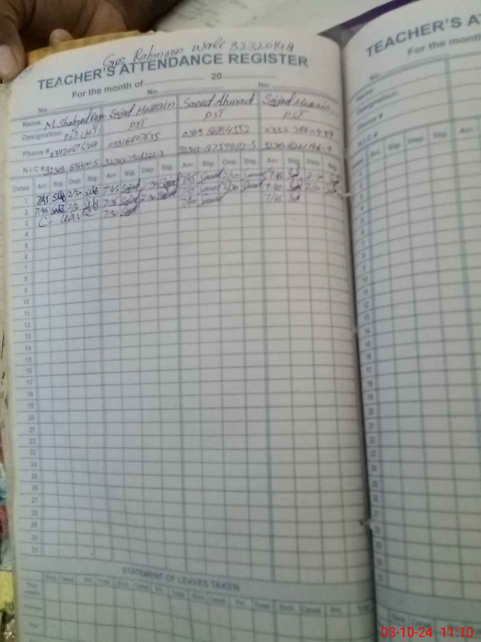 | Name: MSh**** Kh**** Designation: (School Headmaster's/Headmistress's) PST Phone/Cell Number: 03**** |