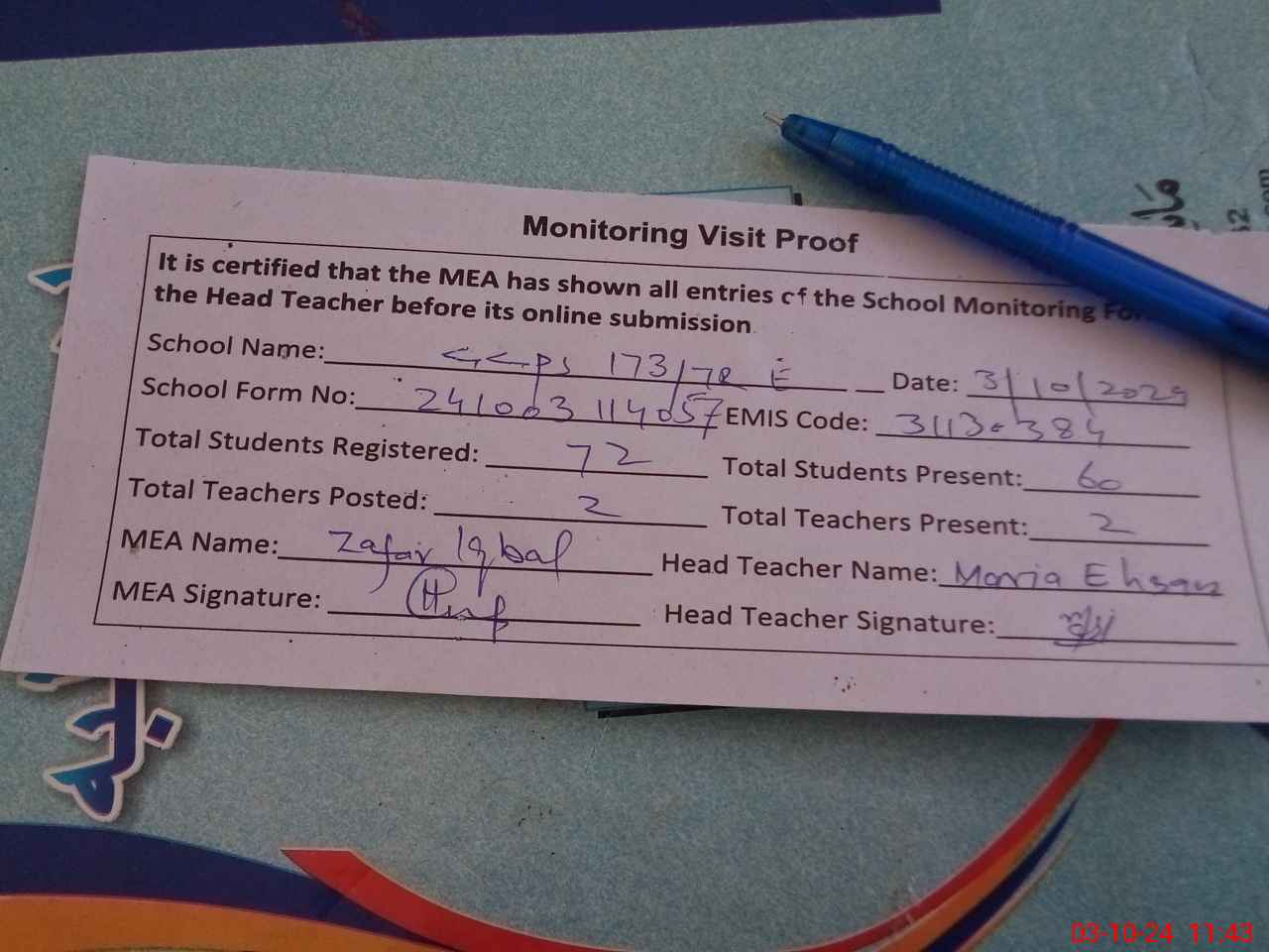 | Monitoring Date: 03-10-2024 | Start Time: 03-10-2024 11:29 AM | End Time: 03-10-2024 11:43 AM | Name of MEA: Za**** Iq**** BN**** | |