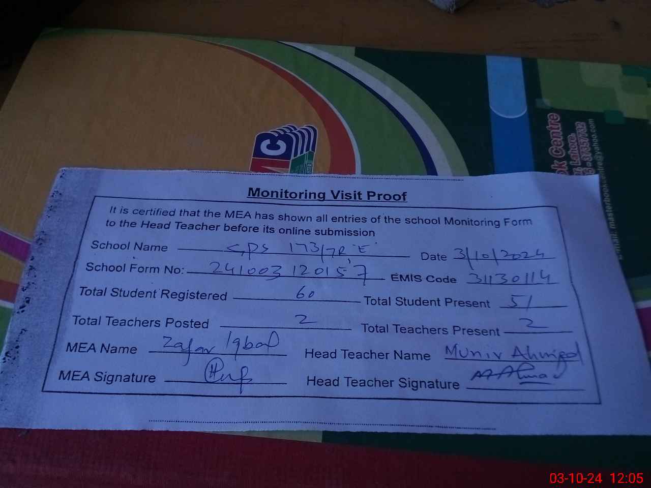 | Attendance Register | Head Teacher | MEA with School | Visit Proof |
