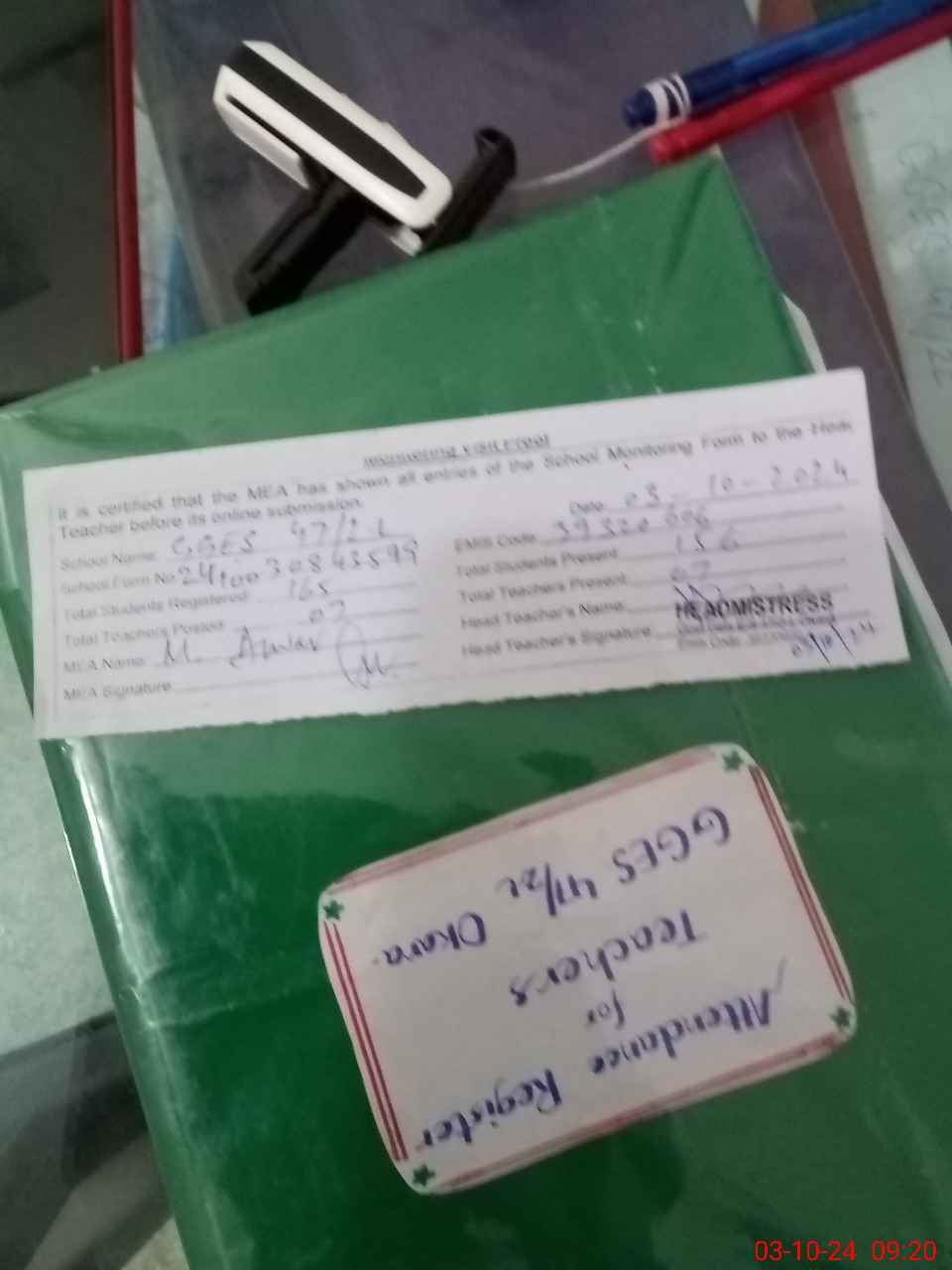 | Attendance Register | Head Teacher | MEA with School | Visit Proof |