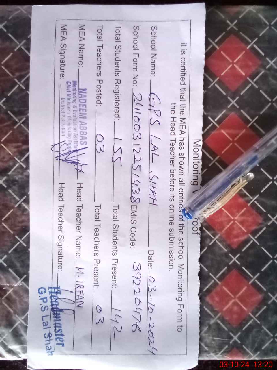 | Attendance Register | Head Teacher | MEA with School | Visit Proof |
