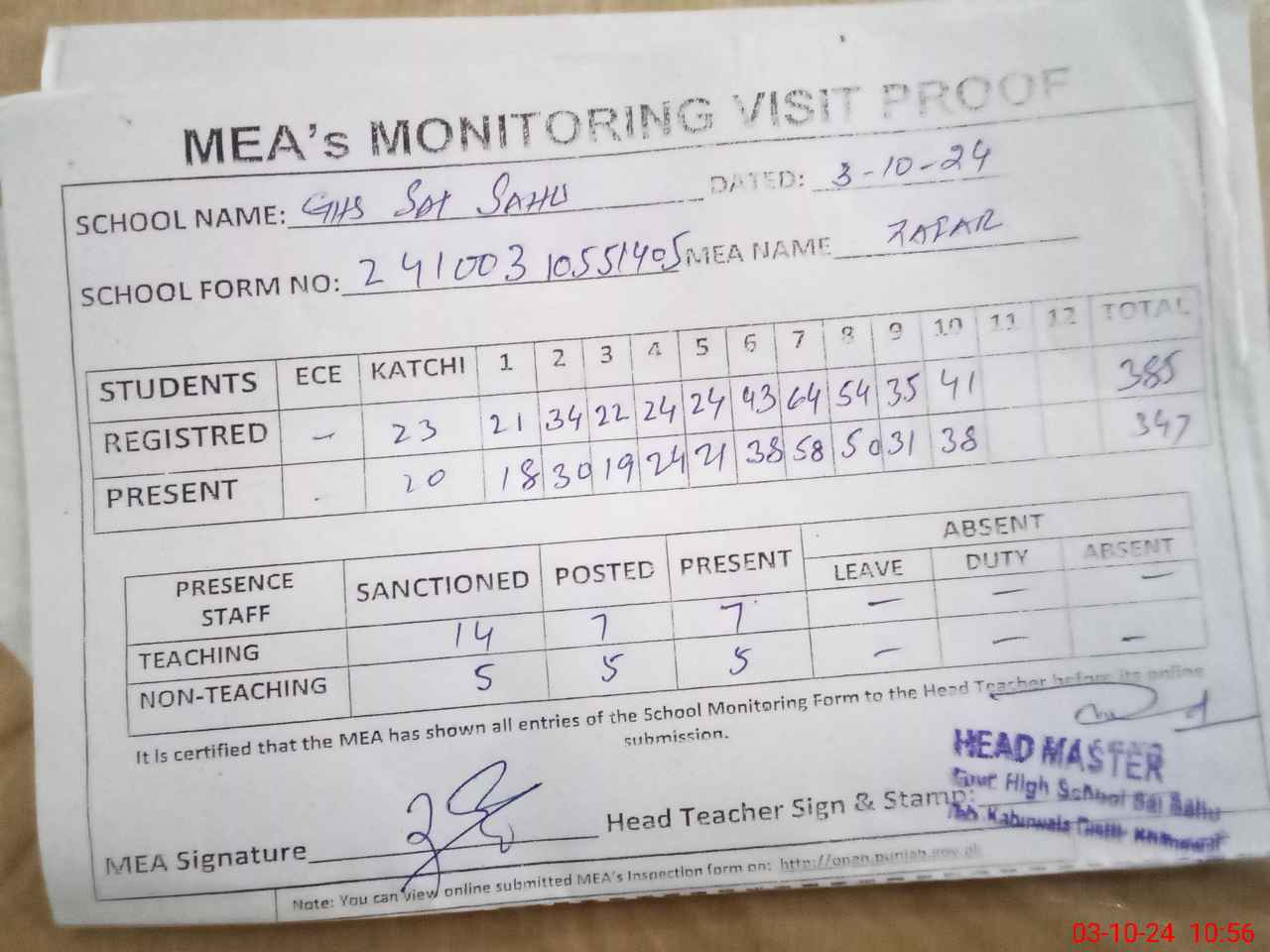 | Attendance Register | Head Teacher | MEA with School | Visit Proof |